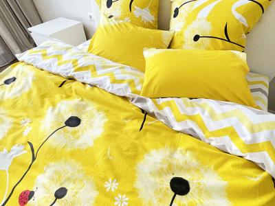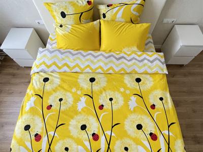 Наволочки и лицевая сторона пододеяльника- крупные одуванчики и божьи коровки на позитивном канареечном фоне. Простыня и оборот пододеяльника выполнен в геометрическом стиле-цветные зигзаги. Упаковочный мешок –из основной ткани или зигзаг.